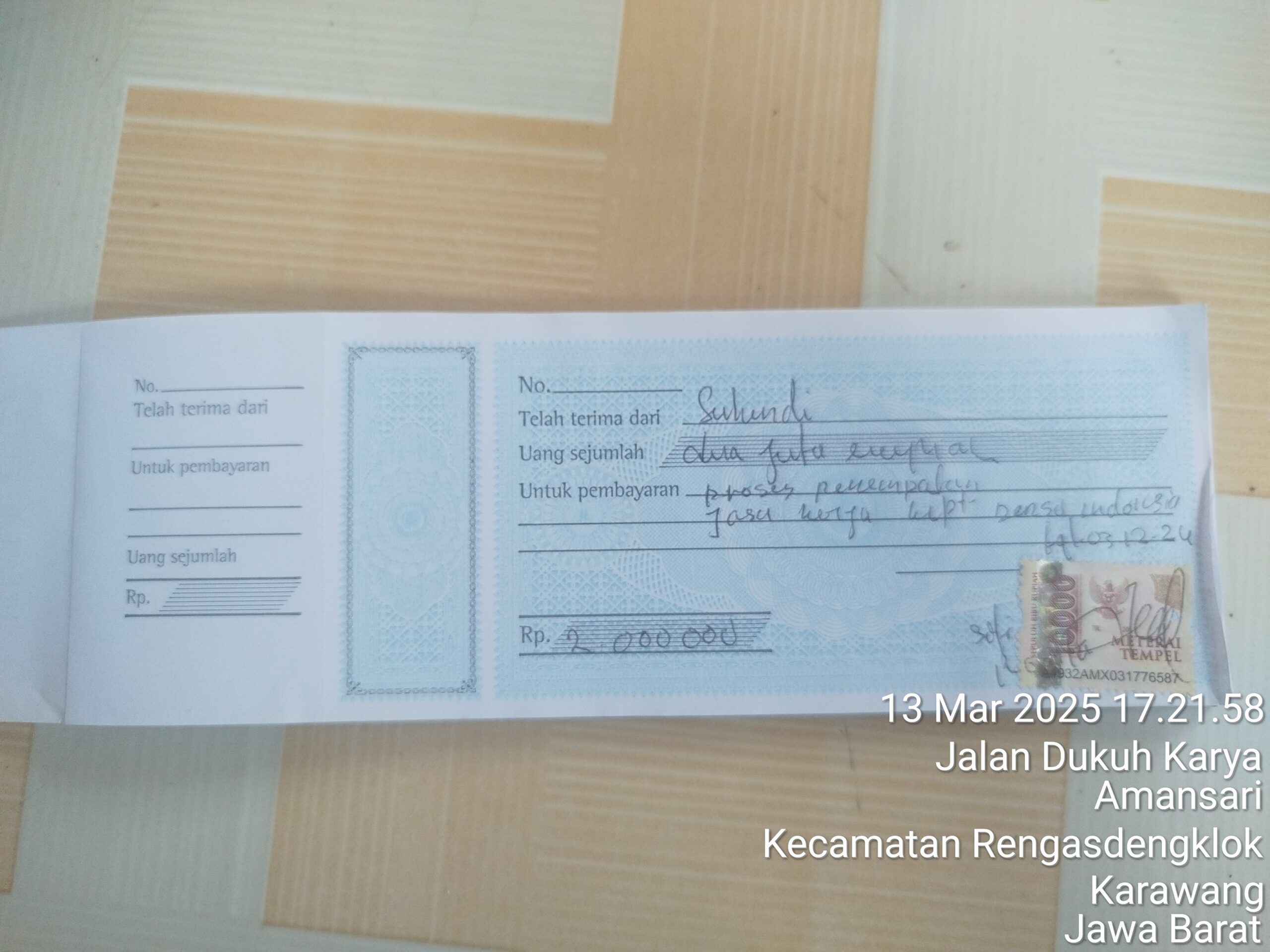 Mala menjelaskan, bahwa suaminya datang memberikan uang langsung kess. dengan bukti kuitansi yang di tandatangani dan bermaterai. bahkan, suaminya pun langsung di berikan seragam perusahaan, tapi pada kenyataan nya semua itu hanya janji janji saja oleh pelaku.” Papar Mala Istri Dari Suhendi kamis (13/03/2025