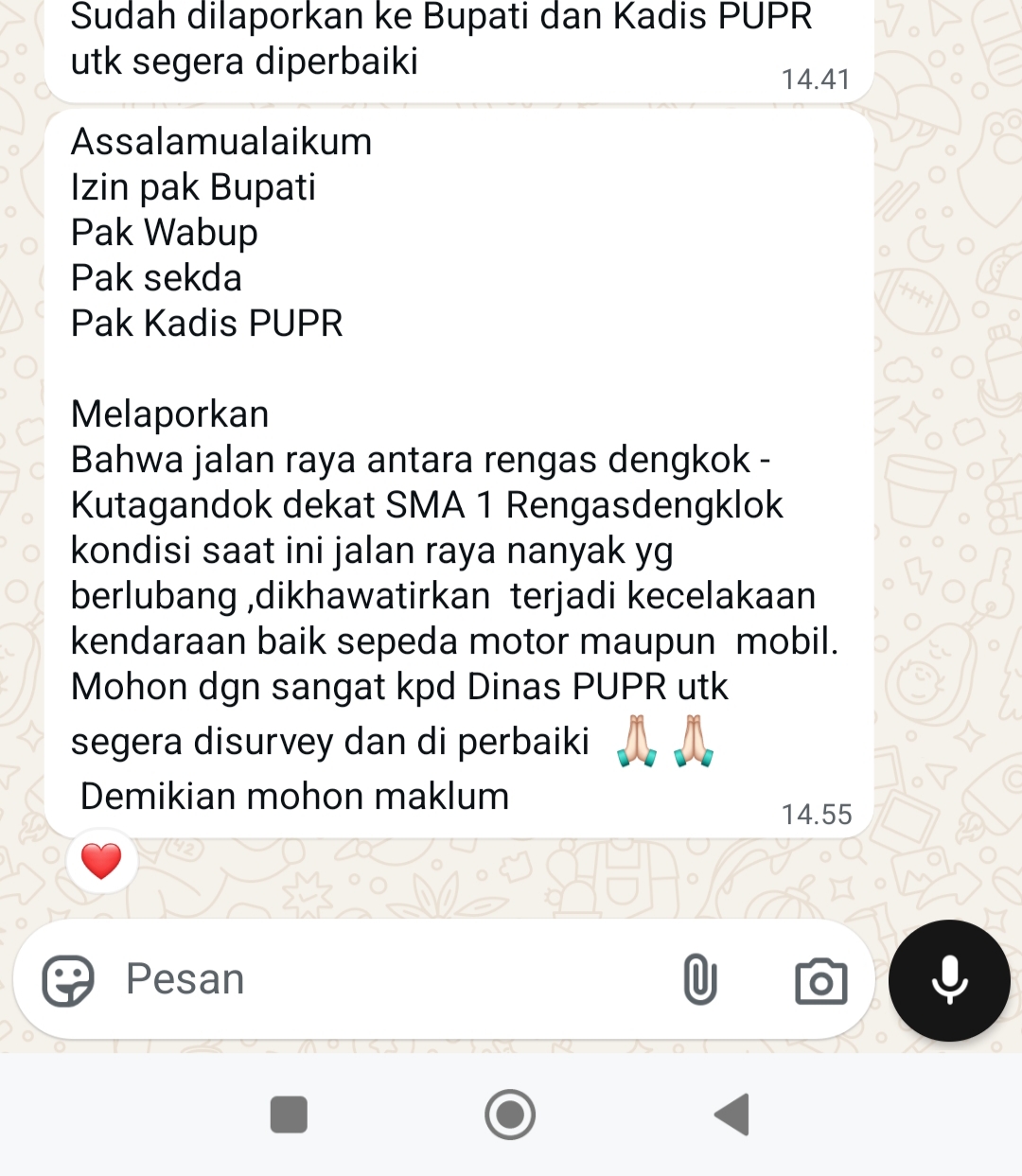 "Siap, sudah dilaporkan ke Bupati dan Kadis PUPR untuk segera diperbaiki." Singkatnya.